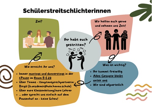 Wo viele Menschen zusammen lernen und leben, entstehen auch mal Konflikte. An der Hohen Landesschule bieten unsere von Frau Meyer ausgebildeten Schülerstreitschlichter Mediationen an, wenn ihr bei einem Streit nicht mehr weiterkommt.